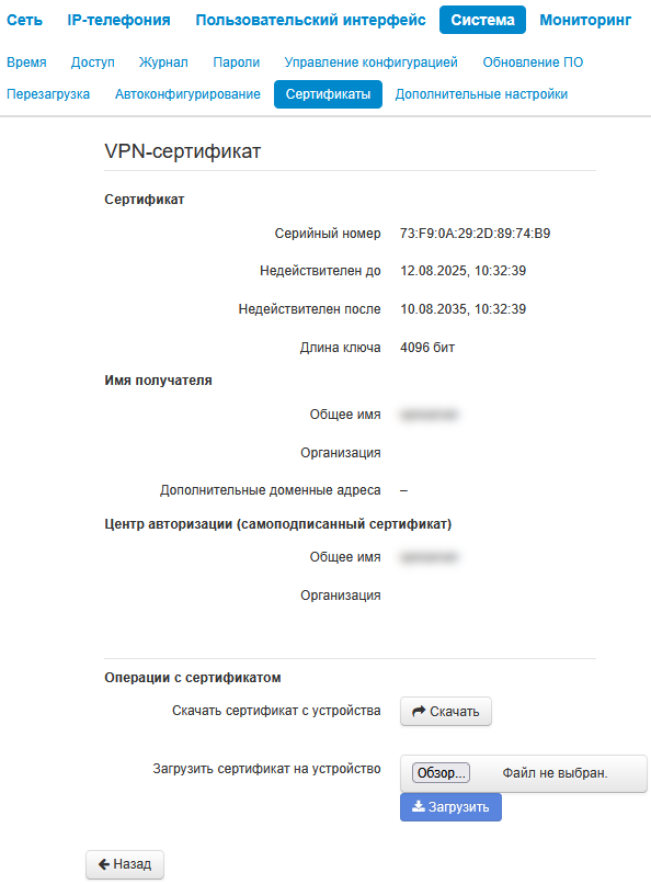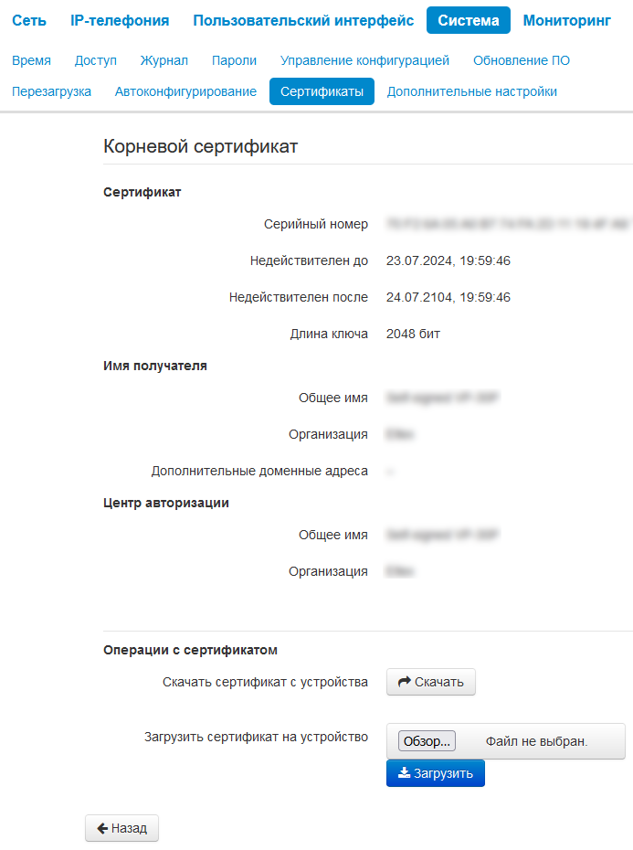 Скачать сертификат с устройства— чтобы сохранить текущий сертификат на устройство, нажмите кнопку «Скачать»;