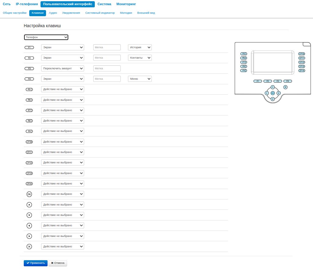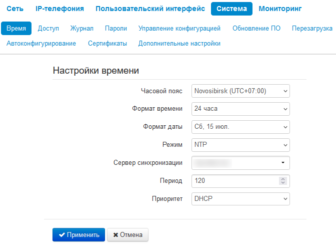 Для вступления в силу новой конфигурации и занесения настроек в энергонезависимую память нажмите кнопку «Применить». Для отмены изменений нажмите кнопку «Отмена».