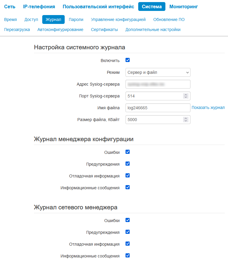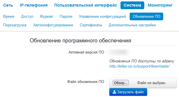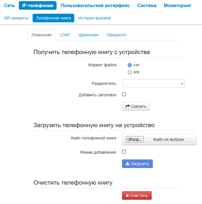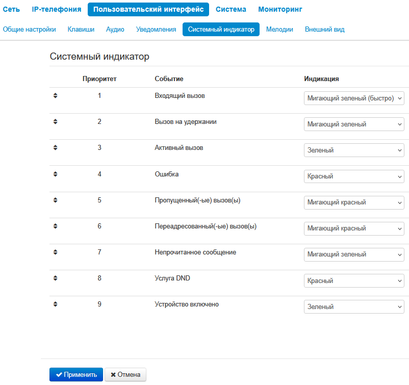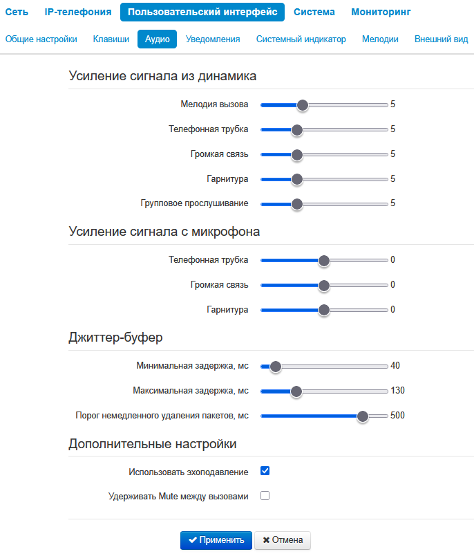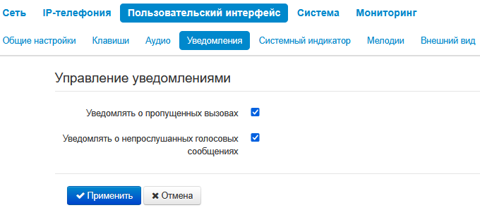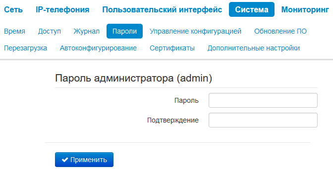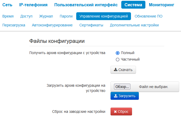 Для перехода в режим конфигурирования устройства в зависимости от цели выберите одну из четырех вкладок: «Сеть», «IP-телефония», «Пользовательский интерфейс» или «Система».