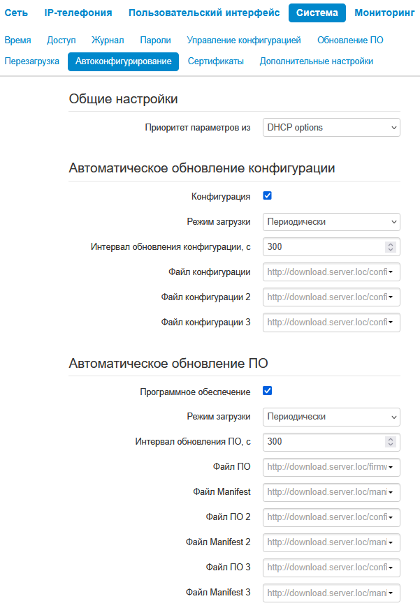 Интервал обновления сертификатов, с — промежуток времени в секундах, через который осуществляется периодическое обновление программного обеспечения устройства;