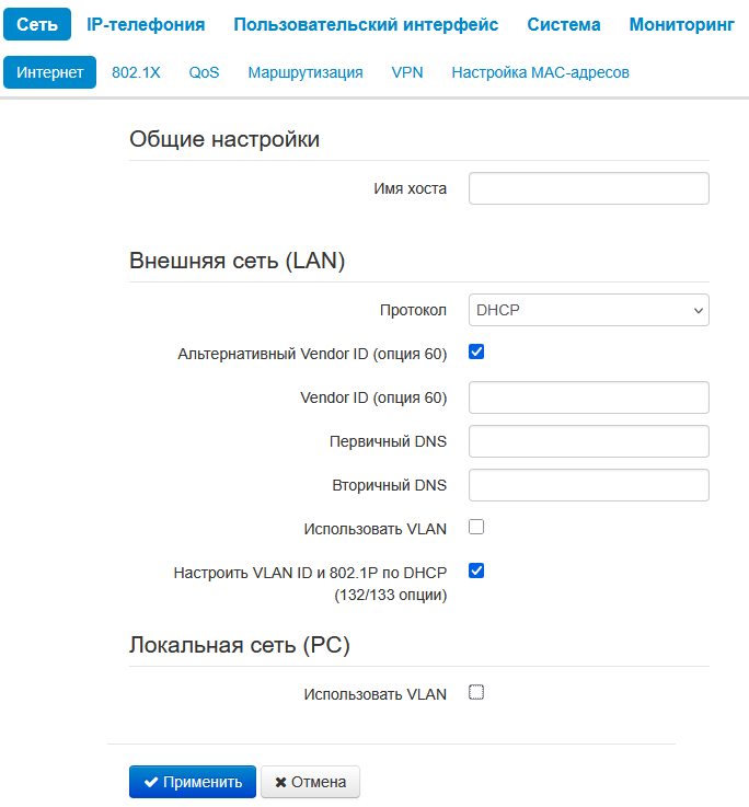Альтернативный Vendor ID (опция 60) — при установленном флаге устройство передаёт в DHCP-сообщениях в опции 60 (Vendor class ID) значение из поля Vendor ID (опция 60). Если флаг Альтернативный Vendor ID (опция 60) не установлен — в опции 60 передается значение по умолчанию, которое имеет следующий формат: