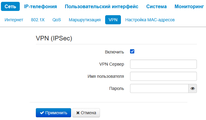 Использовать VLAN — при установленном флаге использовать для выхода в сеть идентификатор VLAN, прописанный в поле «VLAN ID».