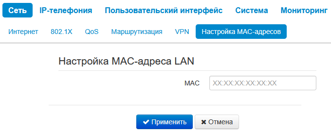 В подменю «Настройка МАС-адресов» можно изменить MAC-адрес LAN-интерфейса устройства.