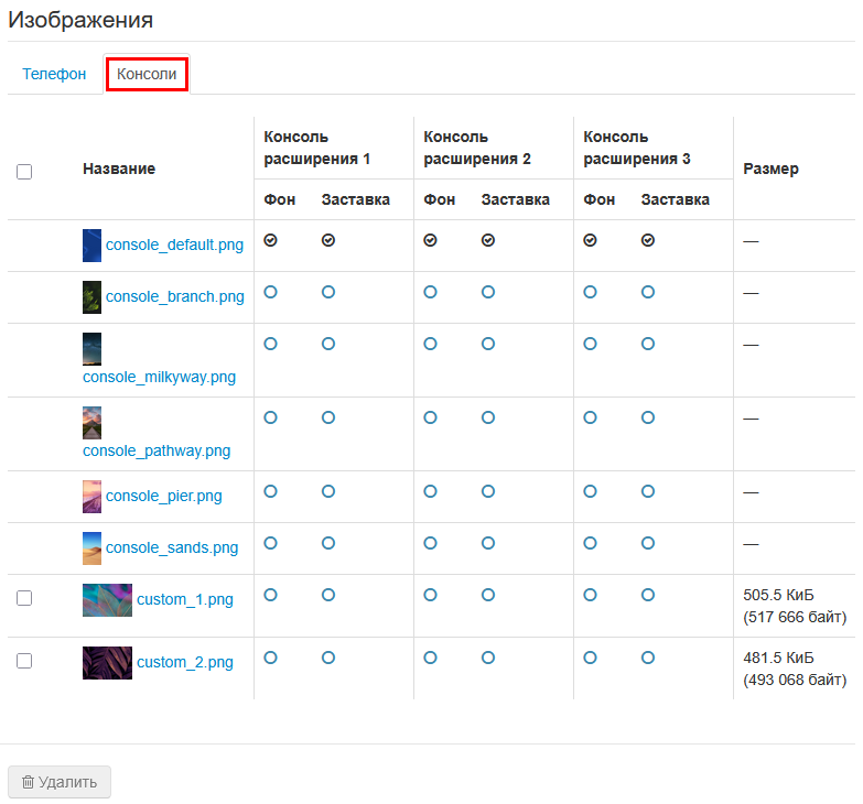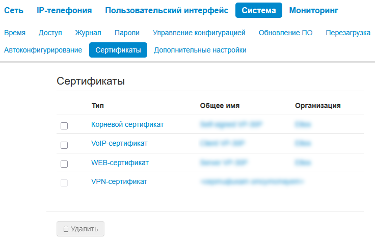 Чтобы удалить существующий сертификат, установите флаг напротив сертификата в списке и нажмите кнопку «Удалить».