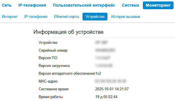 • Время работы — время работы с момента последнего включения или перезагрузки устройства.