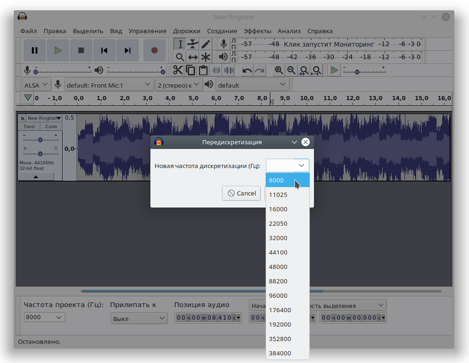 - Смените частоту дискретизации проекта на 8000 Гц в нижней части вспомогательного окна.