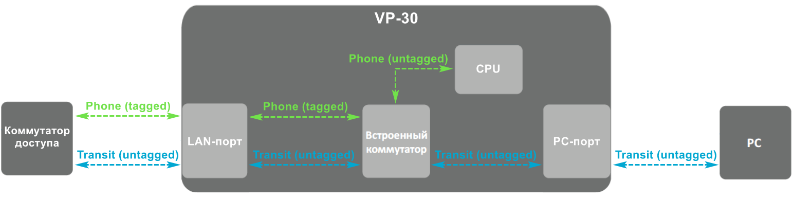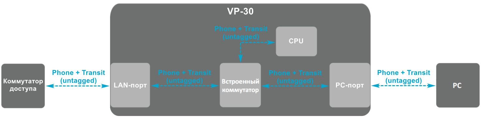 В данном случае сеть настроена по протоколу DHCP или Static с отключенными VLAN для Phone и транзитного трафика. Весь трафик (на схеме обозначен как «Phone + Transit»), проходящий через устройство, будет нетегированным.