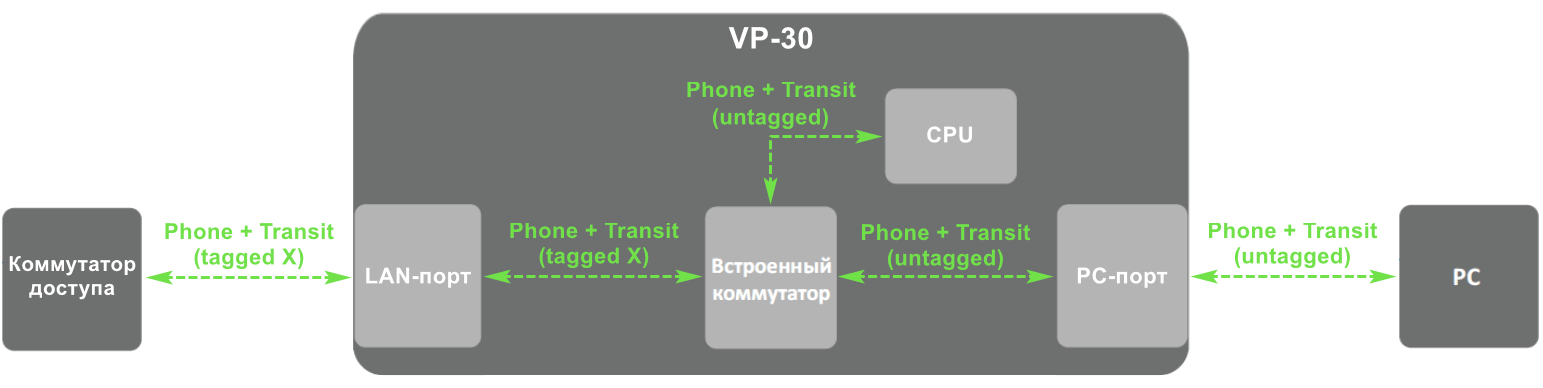 В данном случае сеть настроена по протоколу DHCP или Static с настроенным VLAN для Phone-трафика. Для транзитного трафика VLAN отключен. Трафик, предназначенный для телефона, будет тегированным. Транзитный трафик — нетегированным.