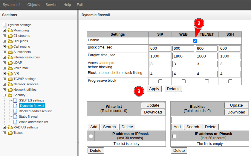 SMG. Enabling and disabling the dynamic firewall (VoIP entities)