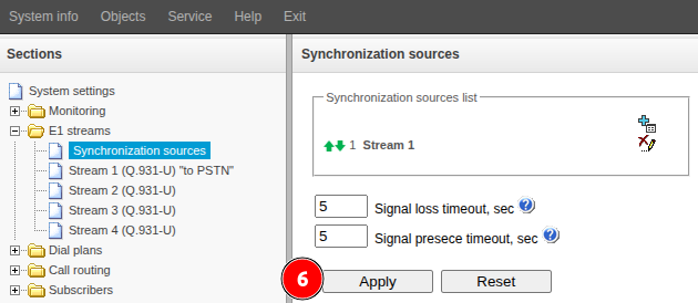 - Go to the "E1 streams" → "Synchronization sources" menu.