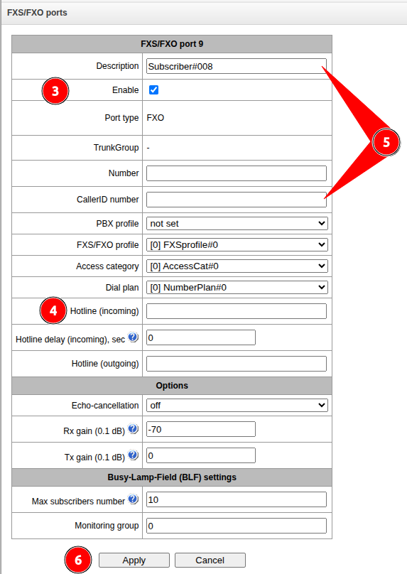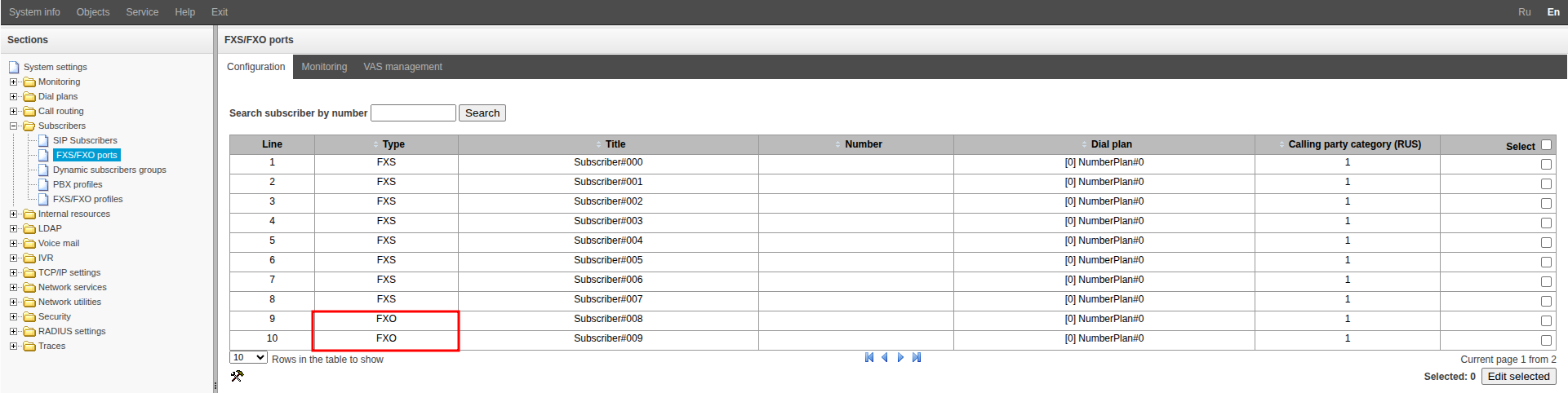 Go to the “Subscribers” → “FXS/FXO ports” menu.