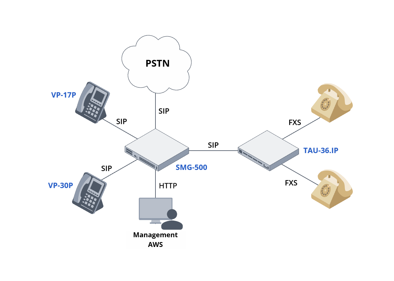 Analog phones are connected to the SMG-500 IP PBX via TAU series analog gateways.