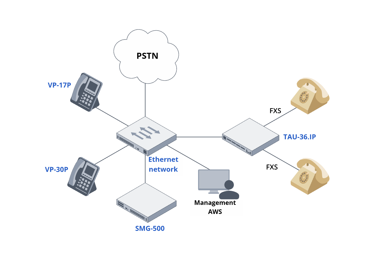 Analog phones are connected to IP PBX via subscriber gateways, such as TAU-36.IP.
