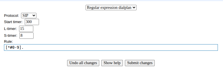 Follow the instructions to set up a dialing plan. Select “Regular expression dialplan.” In the “Rule:” field, enter “[*#0-9]”.