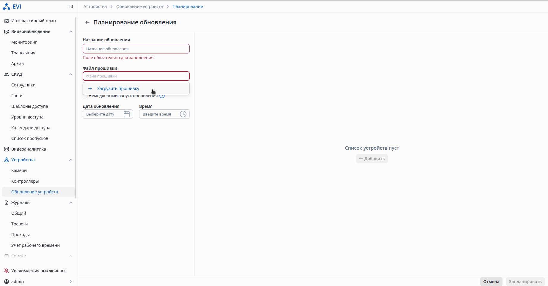 Введите название обновления и нужную дату/время обновления. Если задачу нужно запустить немедленно, проставьте галочку напротив Немедленный запуск обновления, затем нажмите Запланировать.