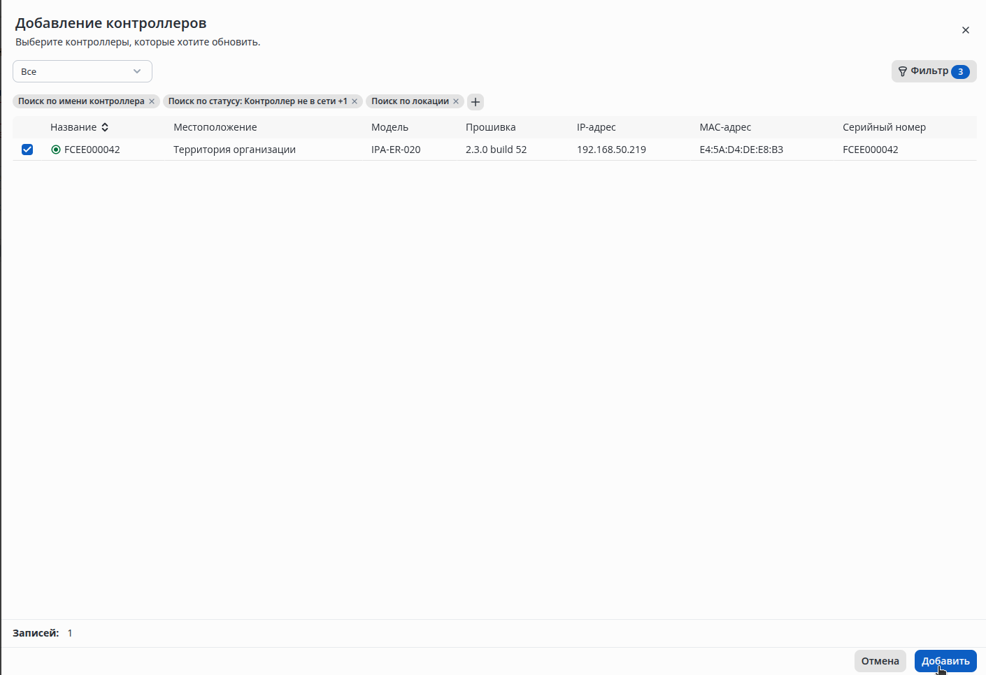 После нажатия на кнопку Добавить откроется список устройств. Выберете нужный контроллер и нажмите добавить.