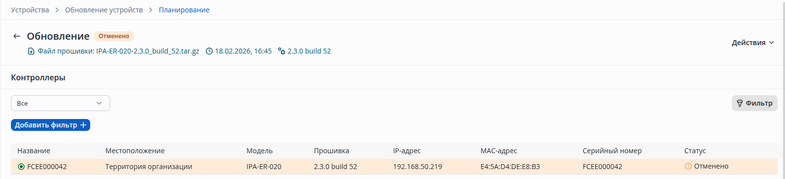 На странице Обновление устройств появится новая задача на обновление.