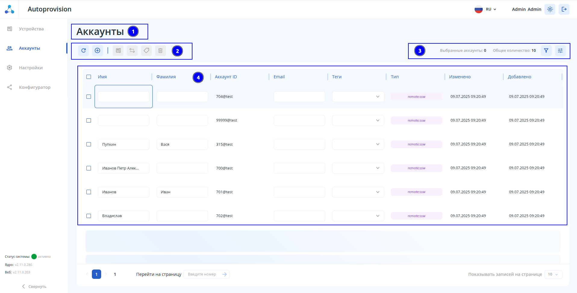- Общее количество 10 — отображает общее количество аккаунтов, которые находятся в списке.