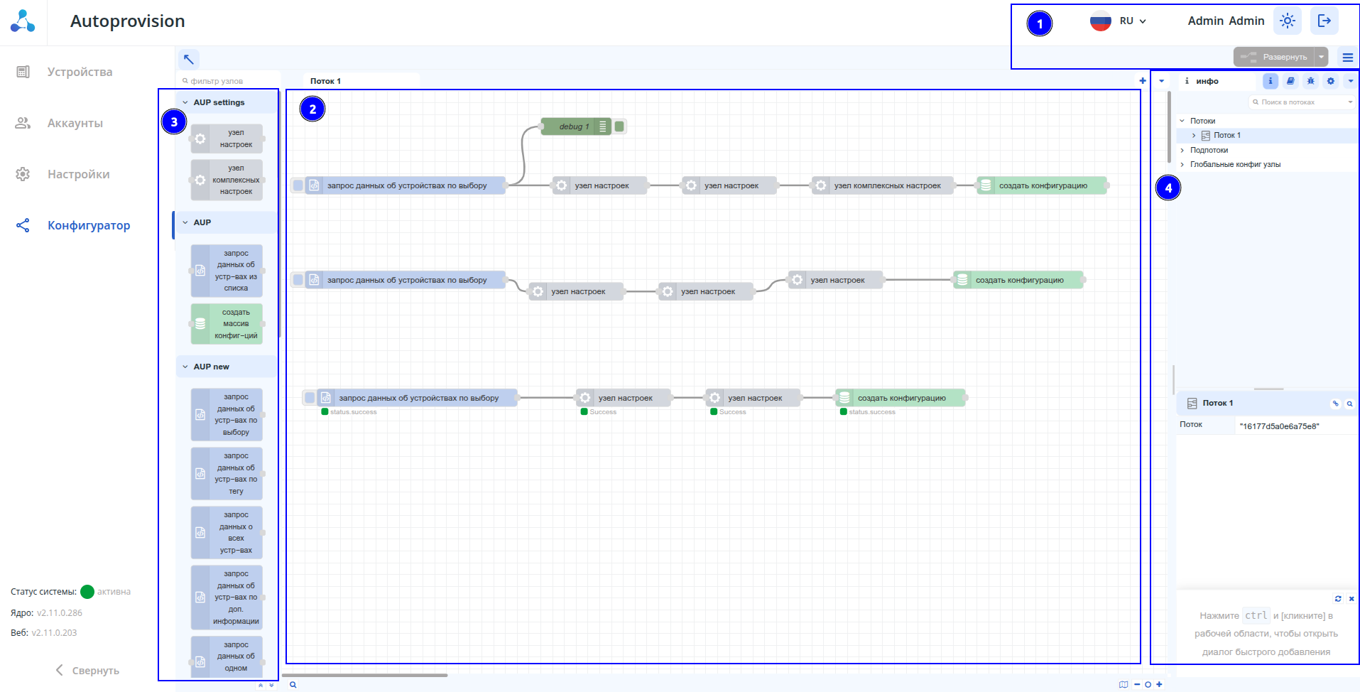 - Основная область (Workspace) содержит текущие конфигурационные потоки с развернутыми в них узлами конфигурации.