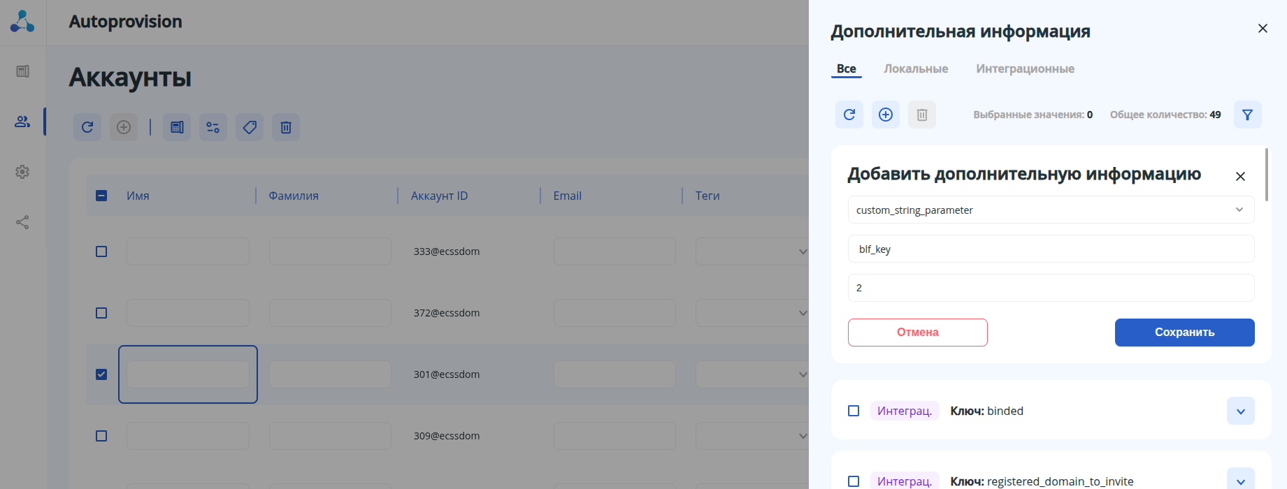 - Добавьте параметр custom_string_parameter с ключом blf_key и значением 2. Таким образом задается значение для номера кнопки, на которой появится настроенный BLF в узле Configurator. Ключ переменной может быть задан в любой удобной форме для пользователя.
