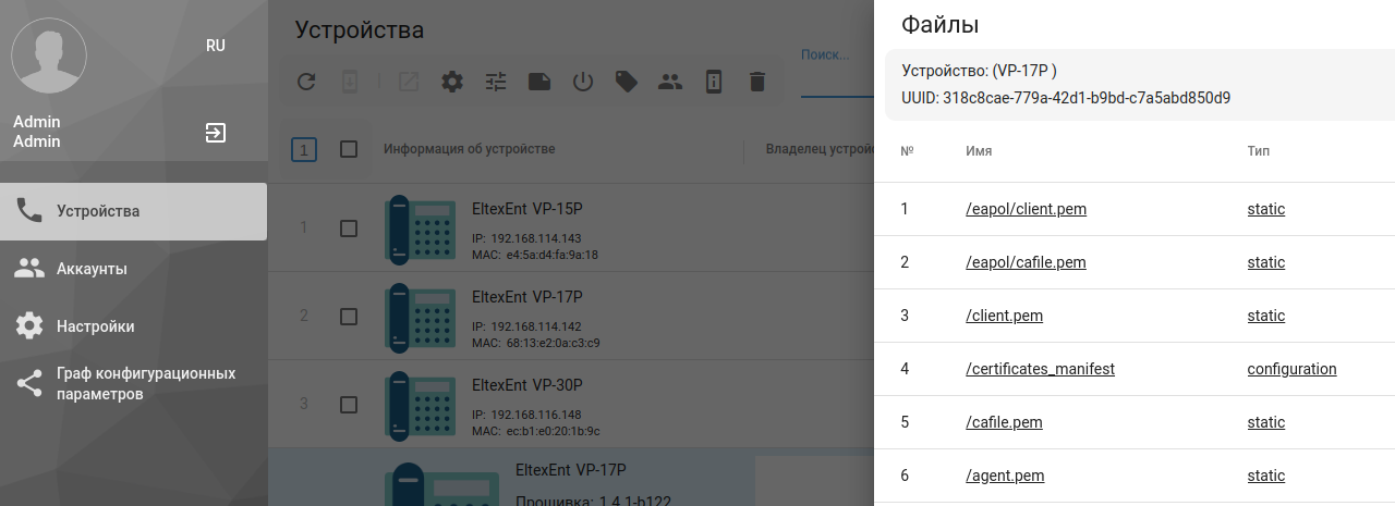 Если всё настроено верно, то на странице «Устройства» в списке скачиваемых телефонным аппаратом файлов можно увидеть скачанные сертификаты: