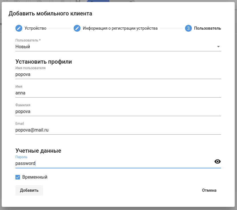 Пользователь — Новый, чтобы создать нового пользователя. Существующий, чтобы выбрать пользователя из ранее созданных/импортированных.