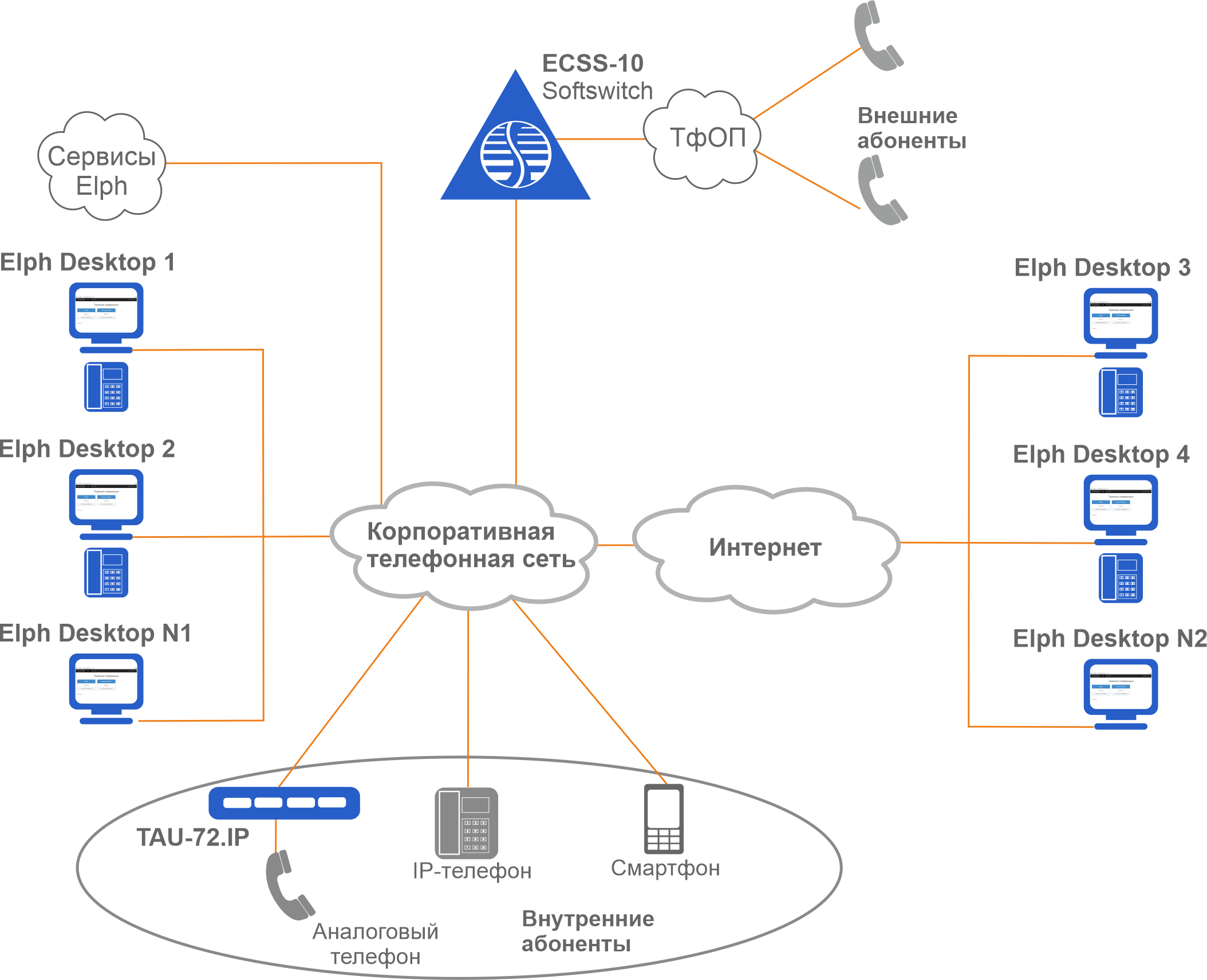 Приложение Elph Desktop — это корпоративный мессенджер, предназначенный для установки на рабочий компьютер. Приложение позволяет расширить функциональность телефонного аппарата, включенного в ECSS-10, а также использовать его как программный SIP-клиент для работы с системой ECSS-10.