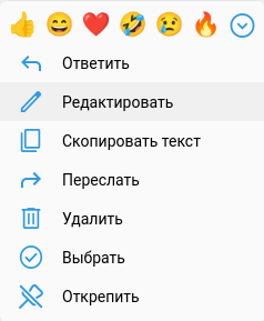 Вызов контекстного меню осуществляется с помощью нажатия правой кнопки мыши на полученное сообщение. На рисунке ниже изображены доступные действия над выбранным сообщением, также вы можете поставить реакцию.