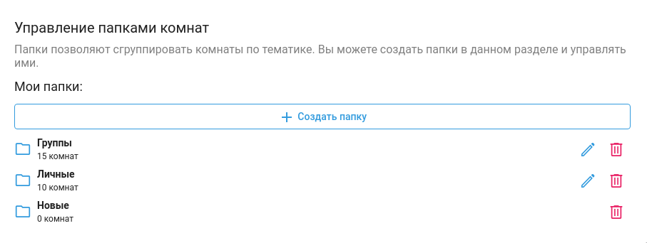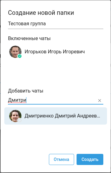 В разделе Настроить с помощью кнопки Создать папку можно создать свою папку с комнатой, дать ей название, добавить требуемые личные и групповые чаты, воспользовавшись строкой поиска.