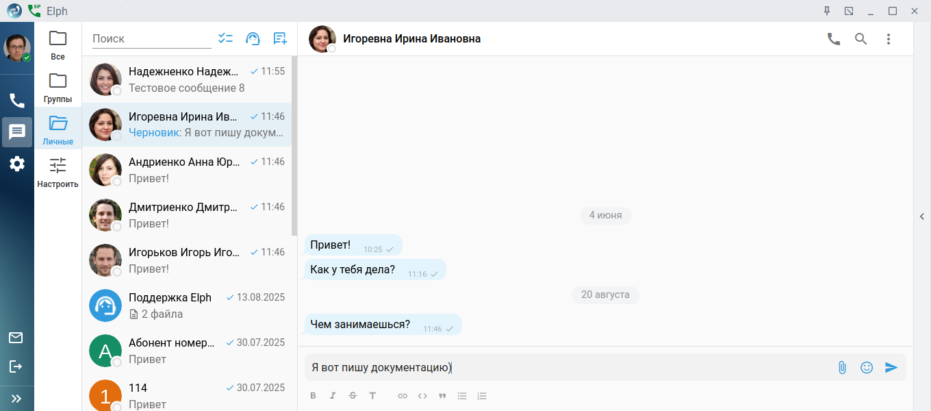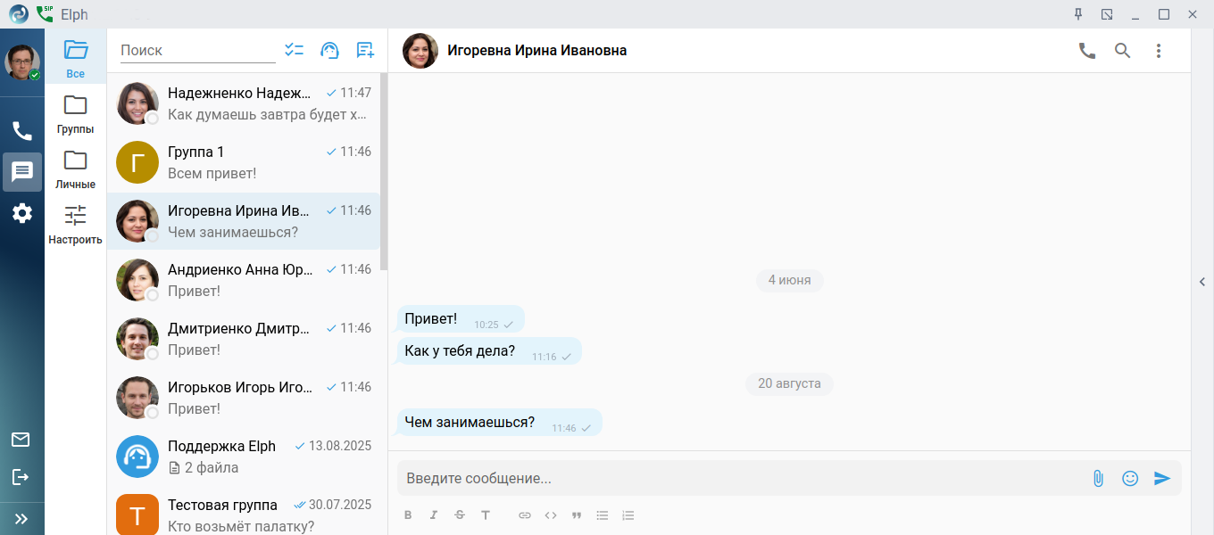 Быстрое и удобное общение в команде — залог продуктивной работы. На этой вкладке пользователю предоставлены инструменты для обмена сообщениями и файлами с коллегами как в личной переписке, так и в командах. Также имеется возможность общения и обмена файлами со службой технической поддержки.