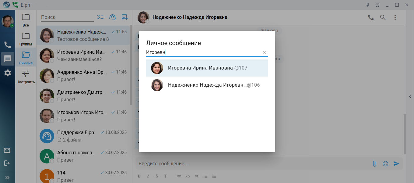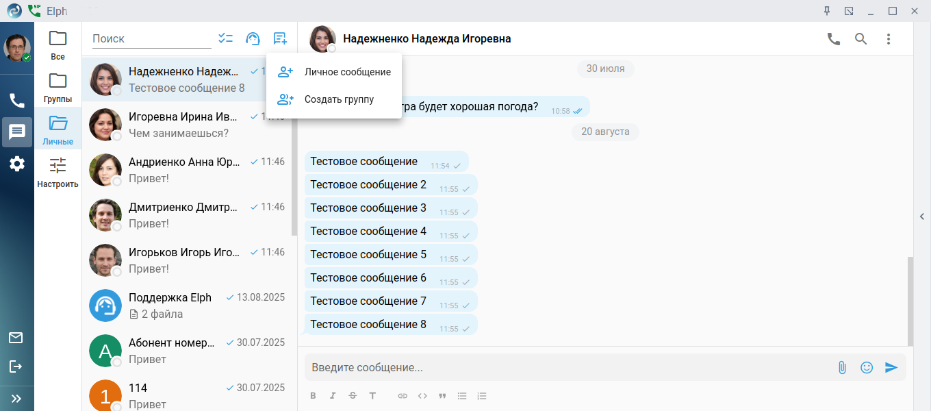 Нажмите кнопку Начать новый чат , далее выберите необходимый пункт меню Личное сообщение или Создать группу.