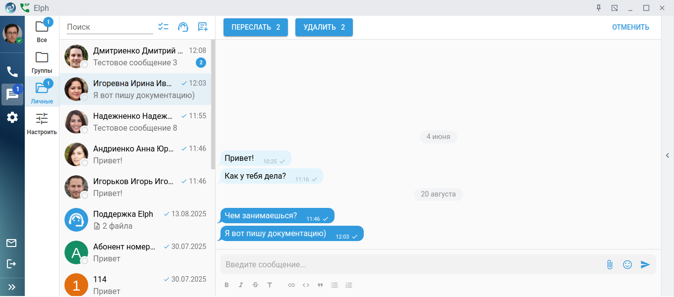 Чтобы переслать несколько сообщений, в контекстном меню нажмите Выбрать и отметьте необходимые сообщения. Нажмите Переслать выделенное или сверху чата нажмите на кнопку Переслать . Для того чтобы убрать выделение со всех сообщений сразу, в контекстном меню выберите пункт Отменить выделение. Если необходимо скопировать выделенные сообщения в буфер обмена, нажмите на Копировать выделенное как текст.