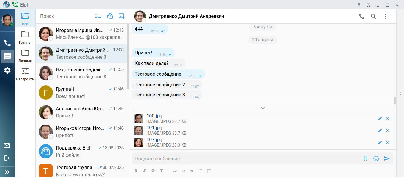 В приложении есть возможность обмена файлами. Для выбора файла нажмите на кнопку Прикрепить файл , при необходимости добавьте сообщение. Вы можете отредактировать имя файла, нажав на кнопку . Для отправки нажмите кнопку Отправить .