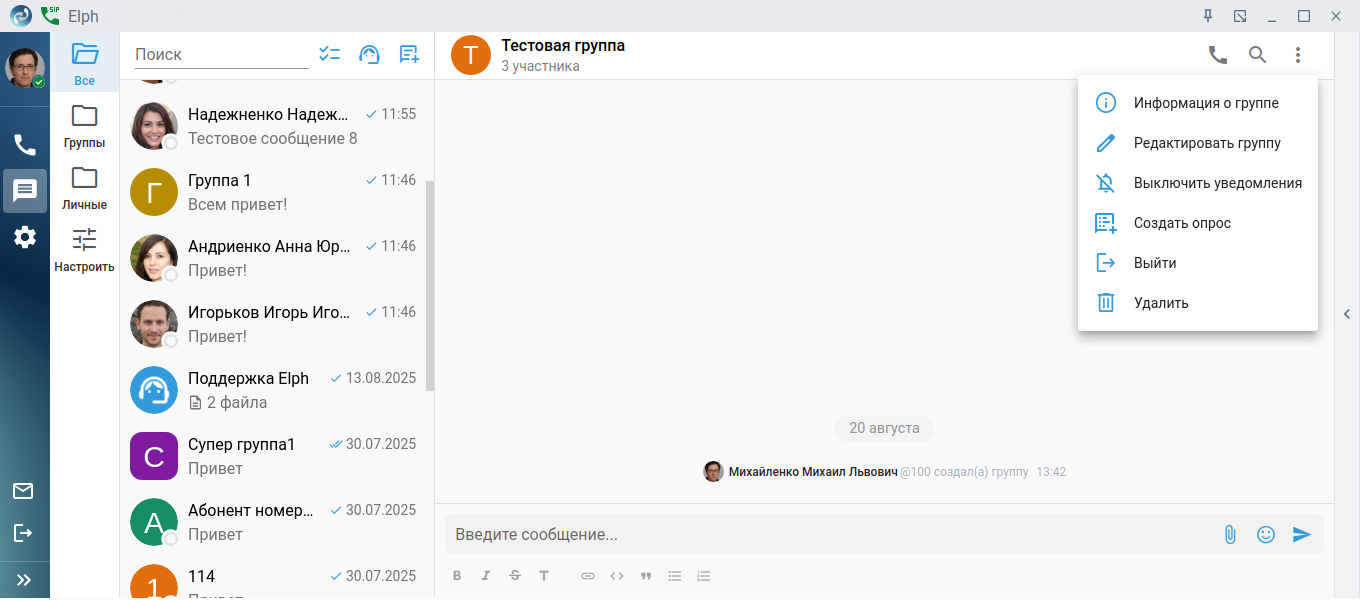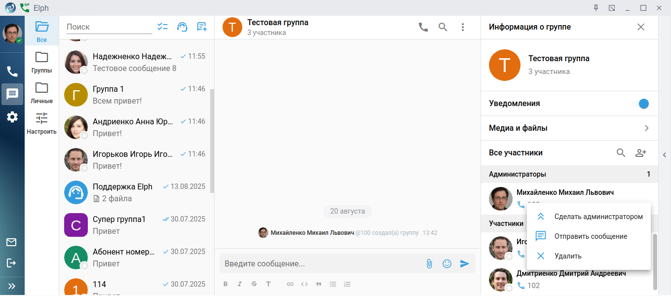 Теперь можно общаться в группе. Администратор группы, может добавлять или удалять участников, удалить группу, включить или выключить уведомления, назначить другого администратора (для этого наведите курсор на интересующего участника, в появившемся меню выберите Сделать администратором).
