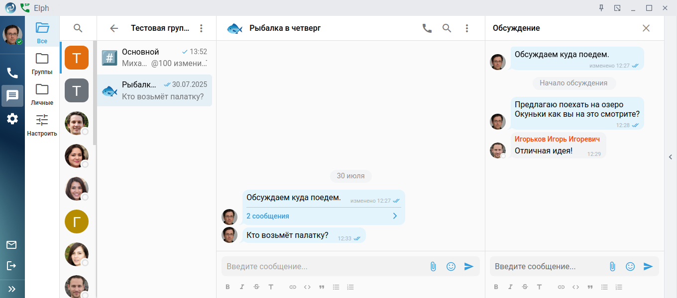 Функционал обсуждений призван дать возможность обсудить то или иное сообщение из группового чата в отдельной комнате. Для того чтобы организовать обсуждение, необходимо кликнуть правой кнопкой мыши на интересующее сообщение и в контекстном меню выбрать пункт Обсудить, откроется отдельное окно для обсуждения.