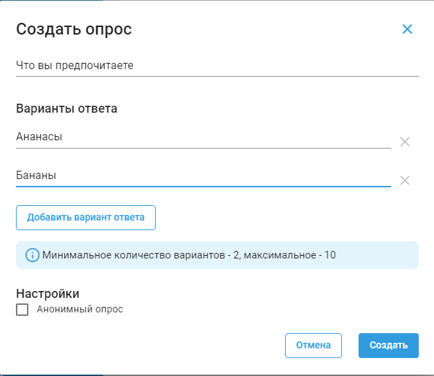 Для отображения возможности отображения опроса участников группы на интересующую тему в меню группы выберите пункт Создать опрос. При активации пункта Анонимный опрос участники не смогут увидеть, кто за какой пункт опроса проголосовал.