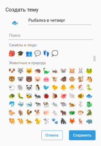 Для создания новой темы в контекстном меню выберите пункт Создать тему. В появившемся окне задайте название, смайл (если смайл не задать явно, он будет выбран случайным образом из имеющихся) и нажмите кнопку Сохранить.
