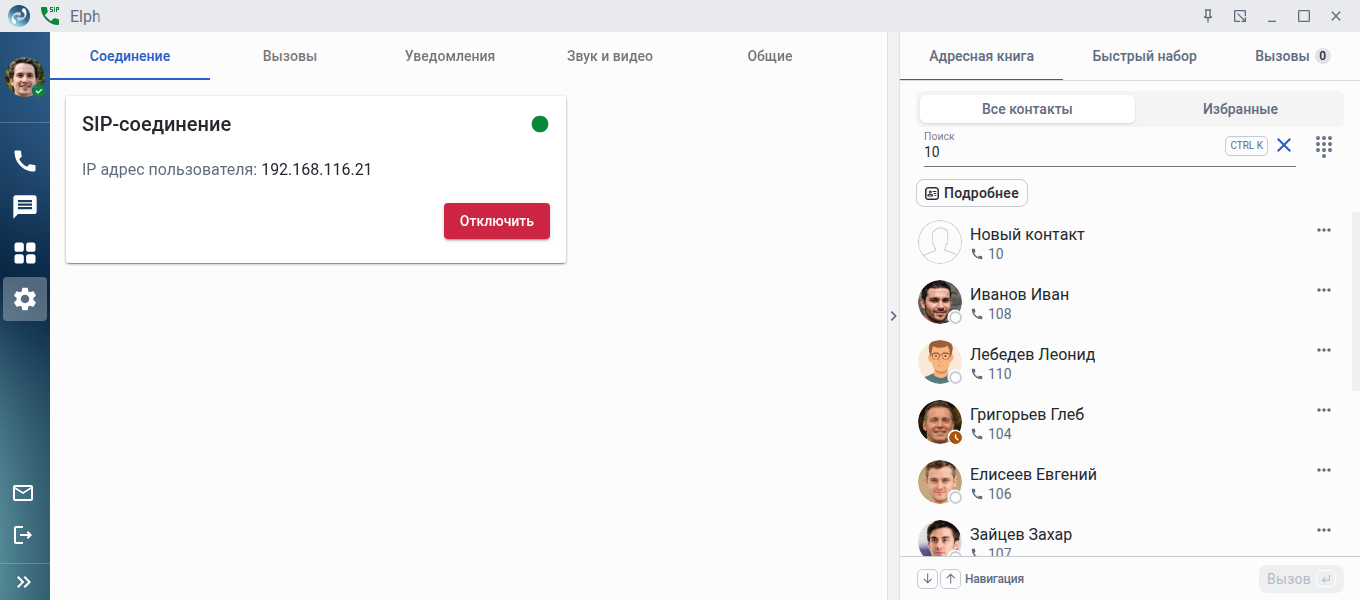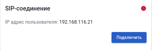 В данном поле отображается IP-адрес сервера, с которым установлено SIP-соединение. В правом верхнем углу отображён статус . При наведении курсора на данную иконку появляется уведомление о дате и времени регистрации. Кроме того, статус отображается в виде иконки с трубкой в панели управления. При необходимости для разрыва SIP-соединения воспользуйтесь кнопкой Отключить.