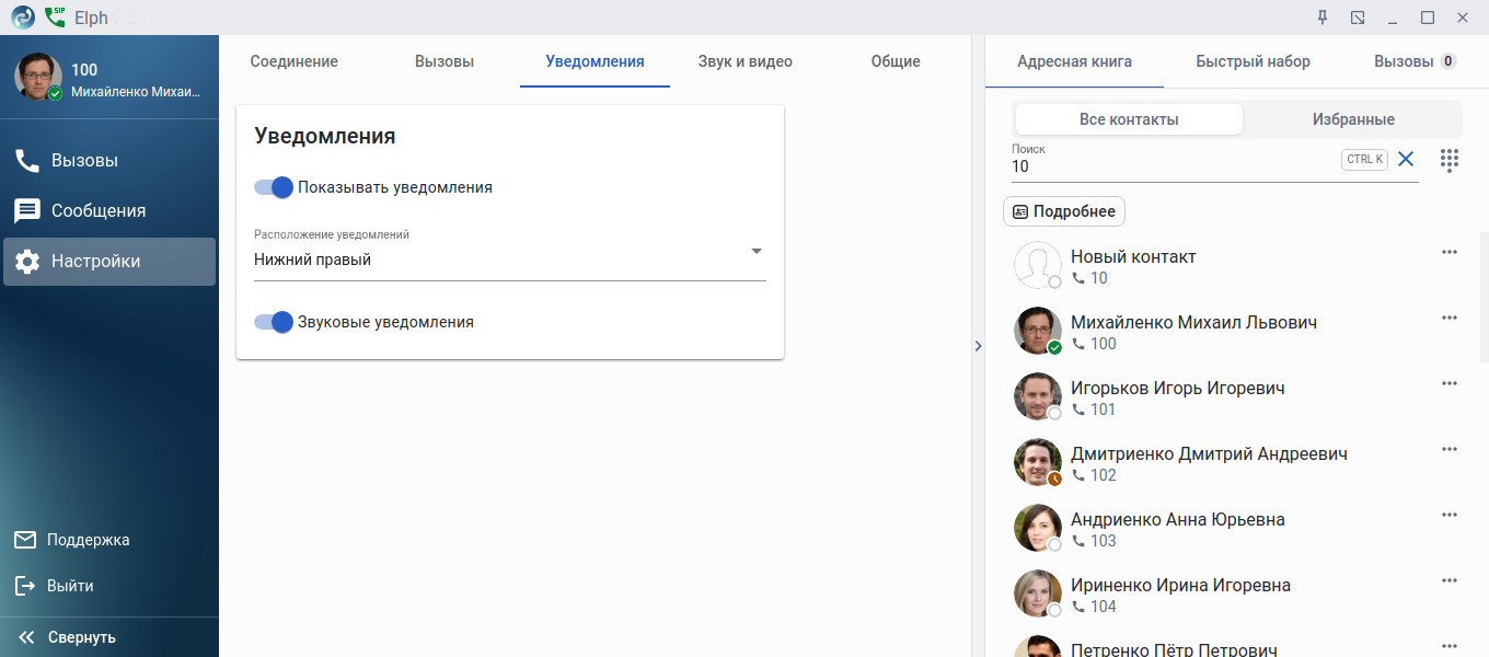 В данной вкладке можно настроить уведомления приложения: отображение на экране, расположение, включение звукового сопровождения при получении нового уведомления.