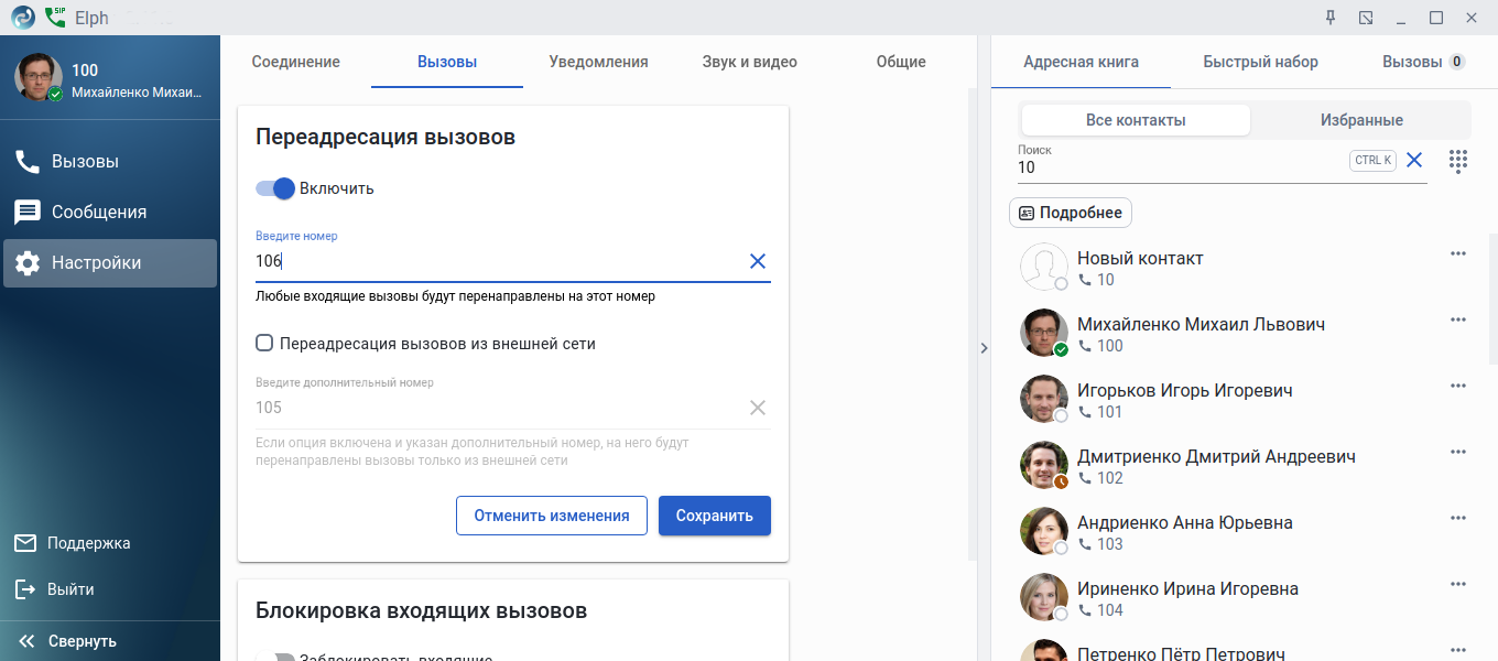 Если включен режим Блокировка входящих вызовов (ДВО «Не беспокоить (dnd)» на ecss-10), все входящие вызовы блокируются, при этом пользователь видит красную плашку с соответствующим уведомлением (отображается в разделе Вызовы), а также красный значок перечёркнутой трубки рядом с аватаром. При необходимости имеется возможность добавить контакты-исключения, входящий звонок от которых будет принят приложением.