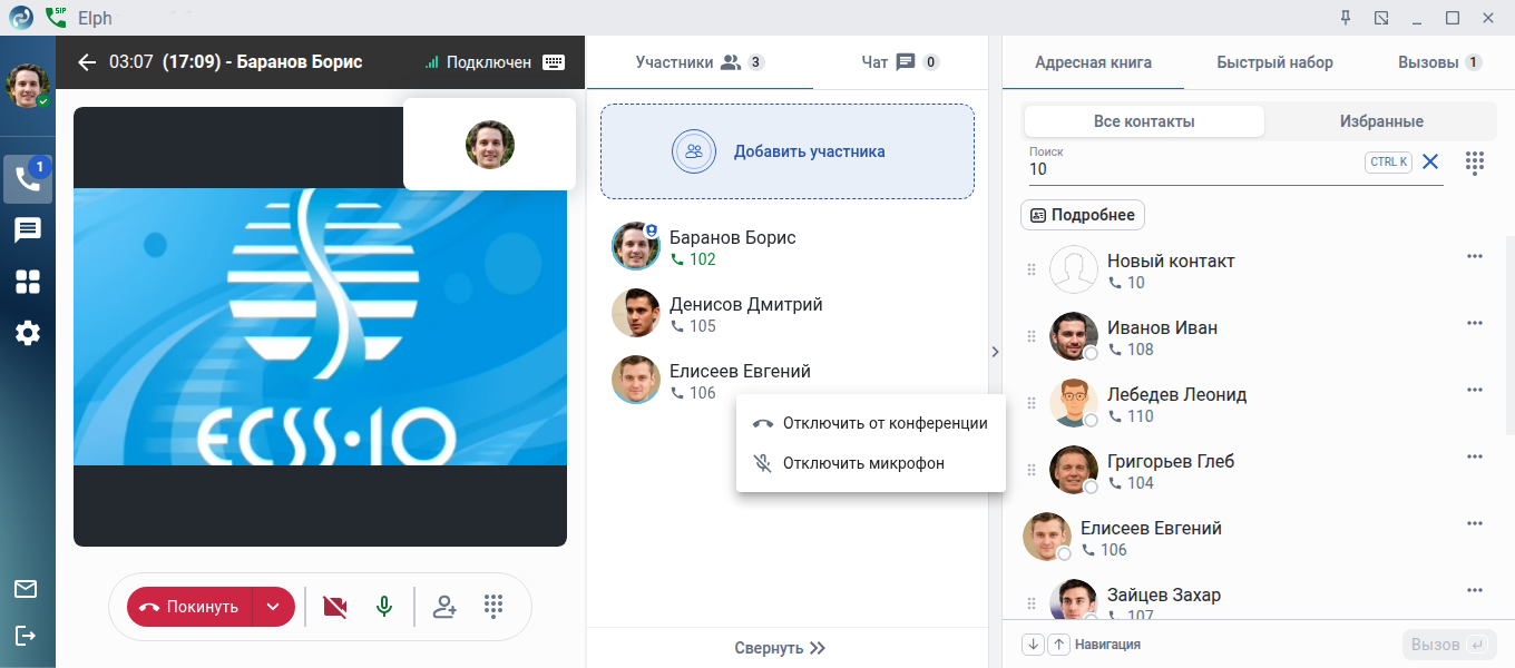 Организатор имеет возможность добавлять новых абонентов (кнопка Добавить участника). Имеется возможность отключать\подключать существующих абонентов и управлять их микрофонами с помощью меню, доступного при нажатии правой кнопки мыши на карточке участника: