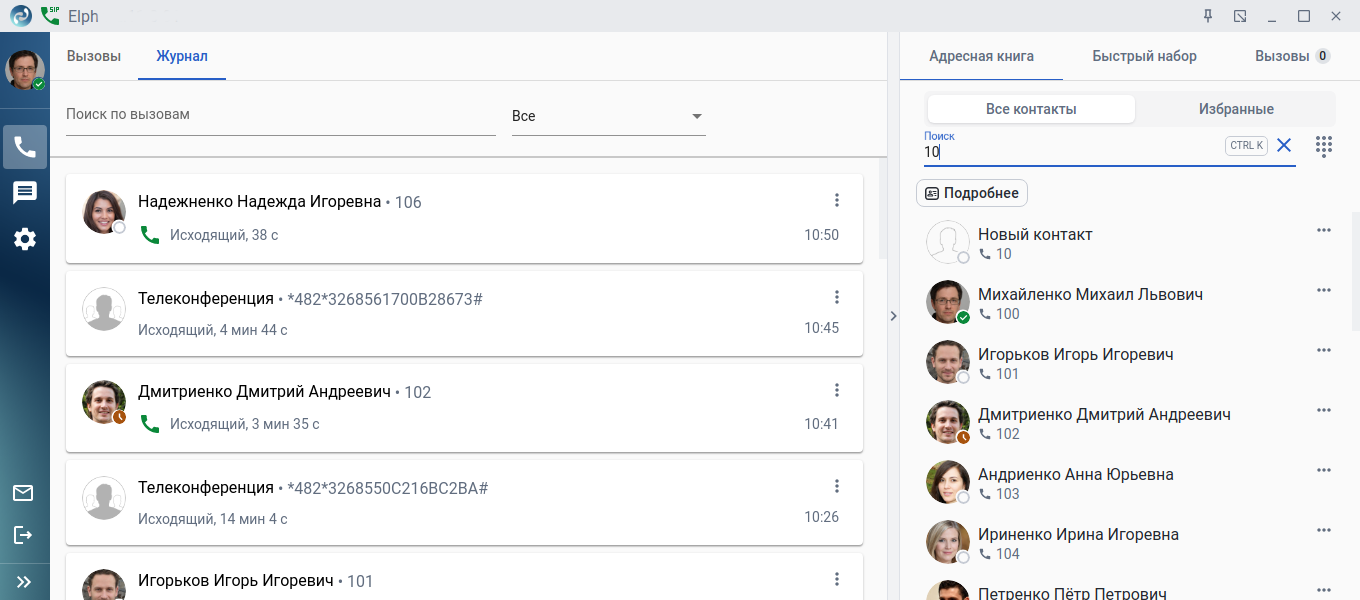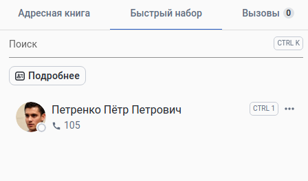 Наведите на абонента курсор мыши и нажмите на значок с зелёной трубкой. Аналогичные действия можно выполнить, если контакт находится в разделе Быстрый набор (контакту из этого раздела можно позвонить, используя указанное справа от контакта сочетание клавиш, в текущем примере «CTRL+1»).