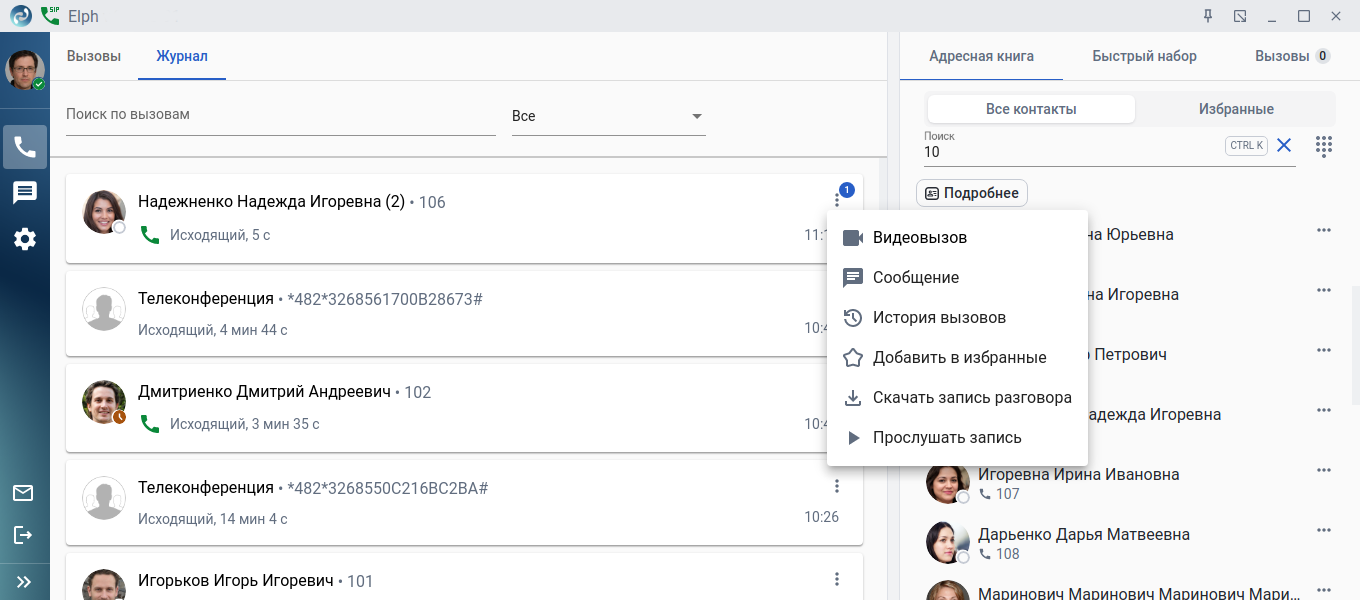 Нажатие на иконку в карточке вызова выводит контекстное меню, где возможно совершить видеовызов, написать в чат, просмотреть историю вызовов, добавить выбранный контакт в избранные контакты. Если в данном вызове использовались сервисы, возле иконки отобразится их количество и в меню выведутся дополнительные пункты: