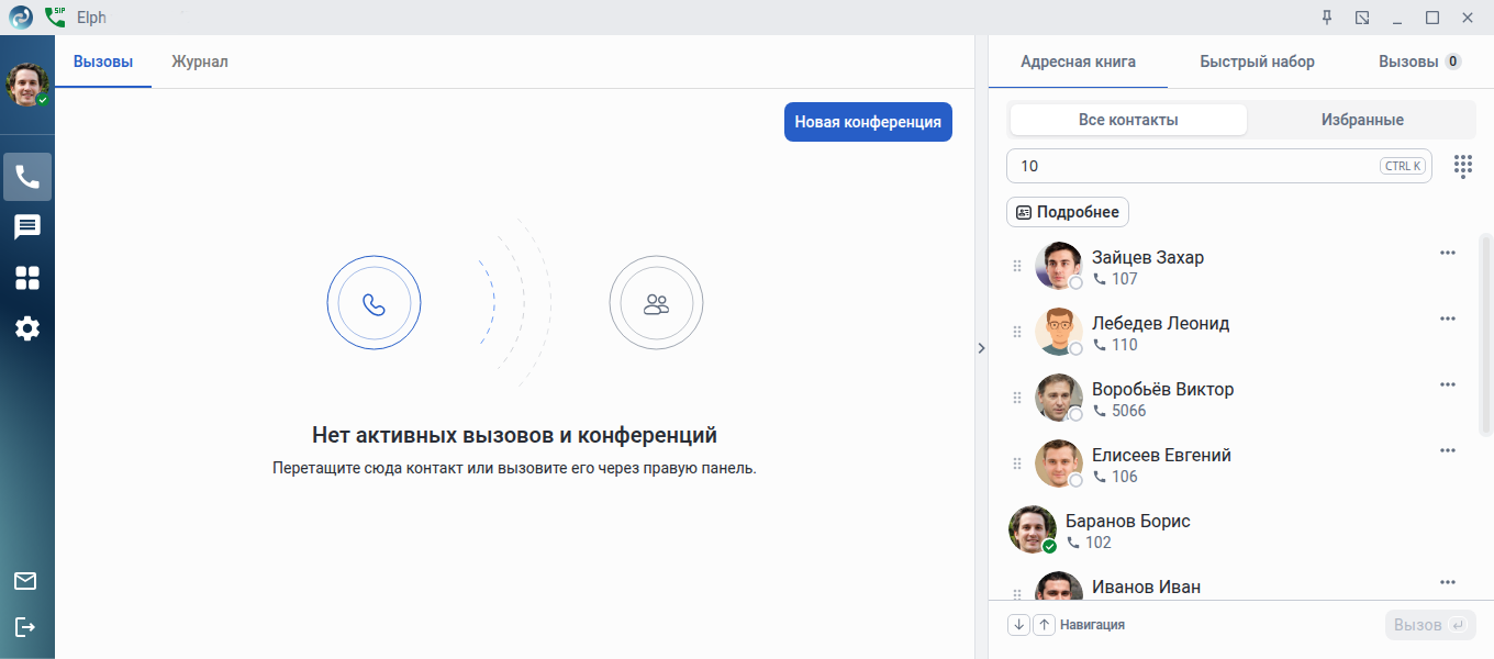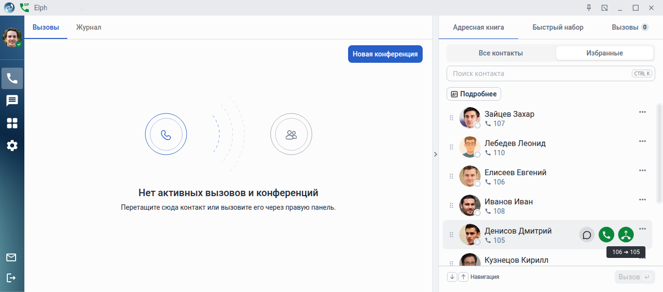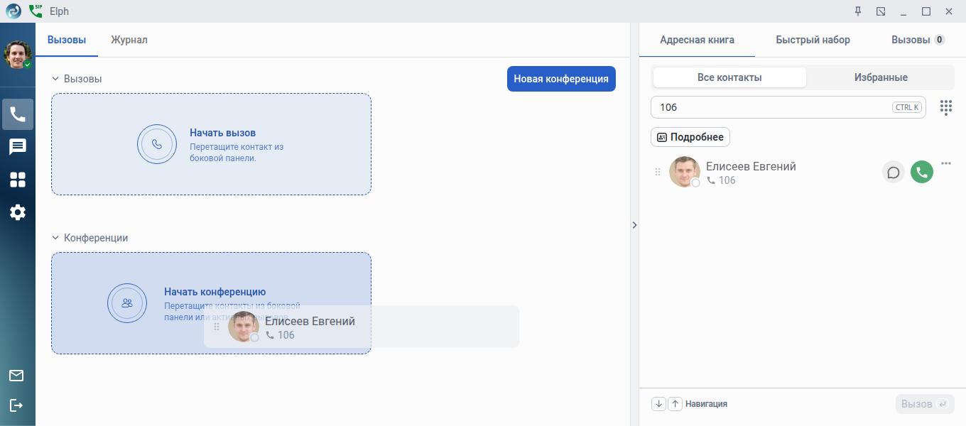 Создать конференцию также возможно при помощи перетаскивания интересующего номера из Адресной книги в центральную область приложения (вкладка Вызовы) «Начать конференцию».