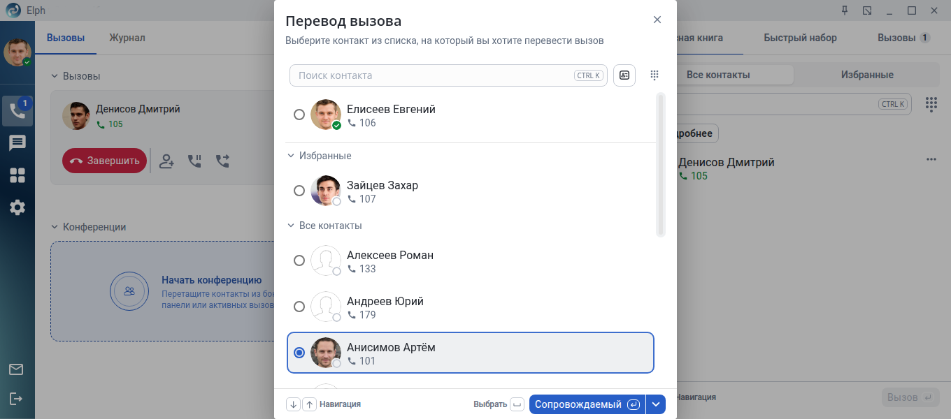 В главном экране звонка или мини-карточке вызова нажмите на кнопку Перевод вызова . В появившемся окне Перевод вызова имеется возможность выбрать абонента из Адресной книги, Избранных контактов, найти с помощью поля «Поиск». Для выбора контакта достаточно нажать на него мышкой либо с помощью стрелок клавиатуры перейти на интересующий контакт и нажать клавишу пробел (повторное нажатие отменит выбор). Следующим шагом выберите тип трансфера: «Сопровождаемый» или «Слепой» (напрямую без предварительного общения с вызываемым абонентом).