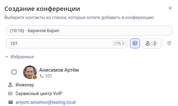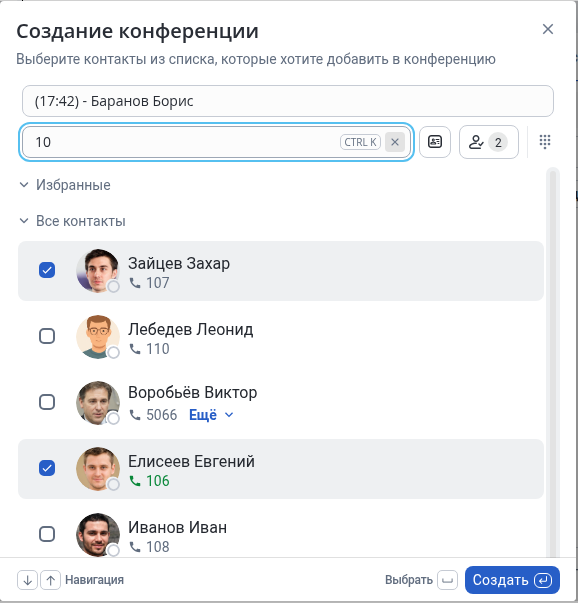 Откроется окно Создание конференции, в котором с помощью поиска можно найти и добавить (отметить) интересующих абонентов, также вам доступен выбор из вкладки Избранные. При нажатии на значок отображаются только выбранные контакты и их количество, при повторном нажатии режим фильтрации снимается. После того как необходимые контакты выбраны, для создания конференции следует нажать кнопку Создать.