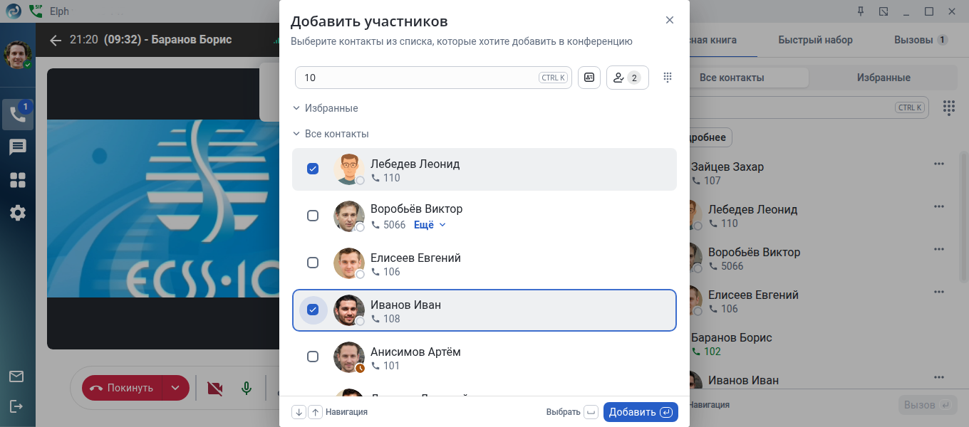 Добавление участников выполняется с помощью соответствующей иконки   или при нажатии кнопки Добавить участника, расположенной над участниками конференции. Открывается окно Добавить участников, в котором доступны аналогичные действия как при создании конференции. После того как отмечены необходимые участники, нажмите кнопку Добавить, выбранные участники будут приглашены в конференцию.