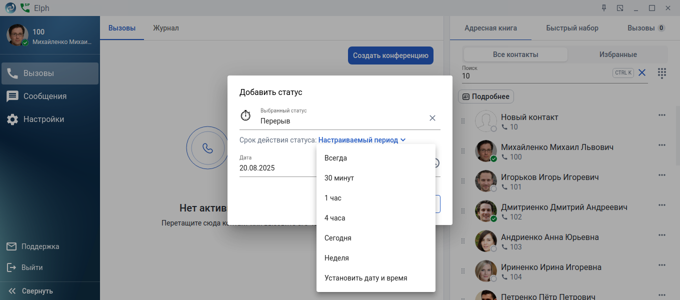 В окне с настраиваемым периодом для выбранного статуса с помощью значка календаря выбирается необходимая дата. С помощью значка с изображением часов— интересующее время, до которого будет действовать выбранный статус.