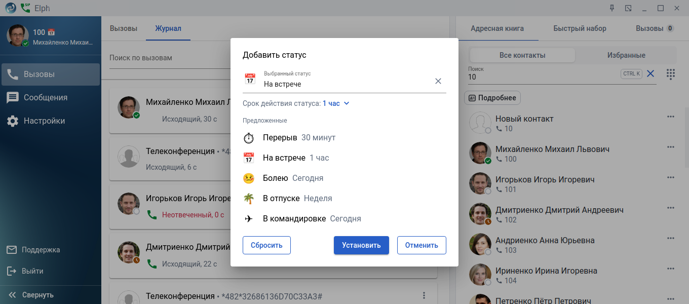 Указанный пользователем статус появляется справа от аватара (при наведении на него отображается информация о статусе и времени, до которого он действует). Другие пользователи также видят статус пользователя во вкладке Журнал.