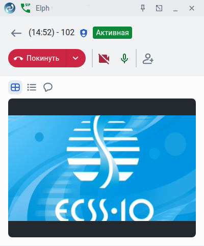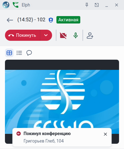 В развёрнутом виде в окне конференции доступны кнопки управления и появляется возможность нажать на область, в которой отображено время создания конференции и номер администратора конференции. Только администратор конференции имеет возможность её завершить, поэтому в правой части кнопки Покинуть имеется дополнительная опция в виде стрелочки, позволяющая администратору завершить конференцию либо выйти из неё. Аналогично покинуть конференцию можно путём нажатия на кнопку Покинуть.
